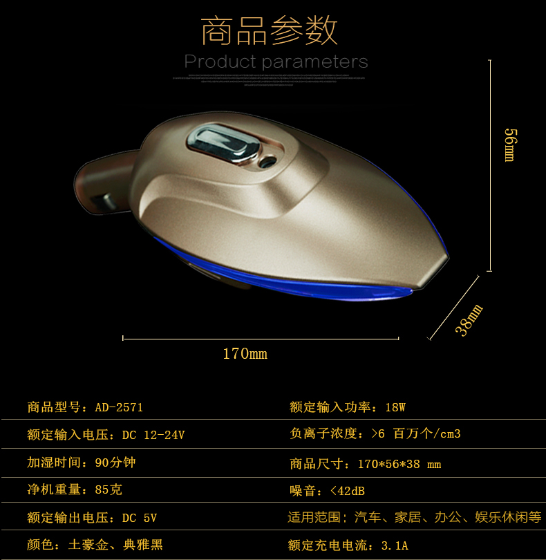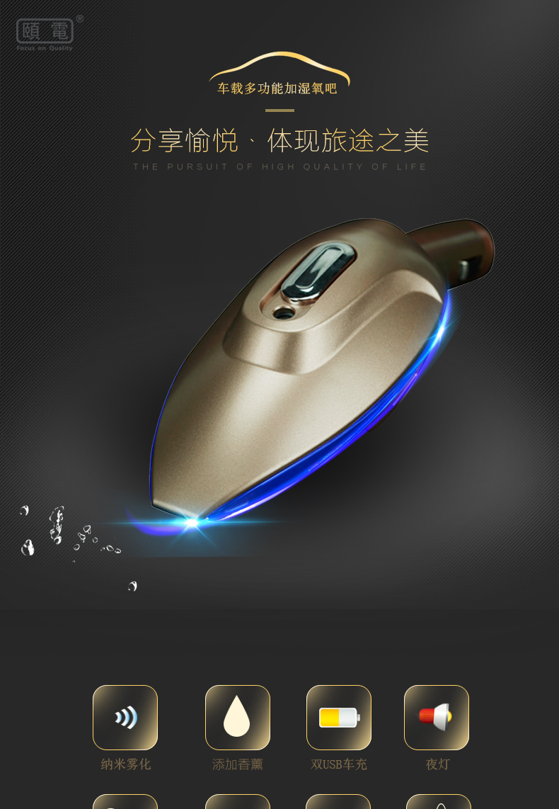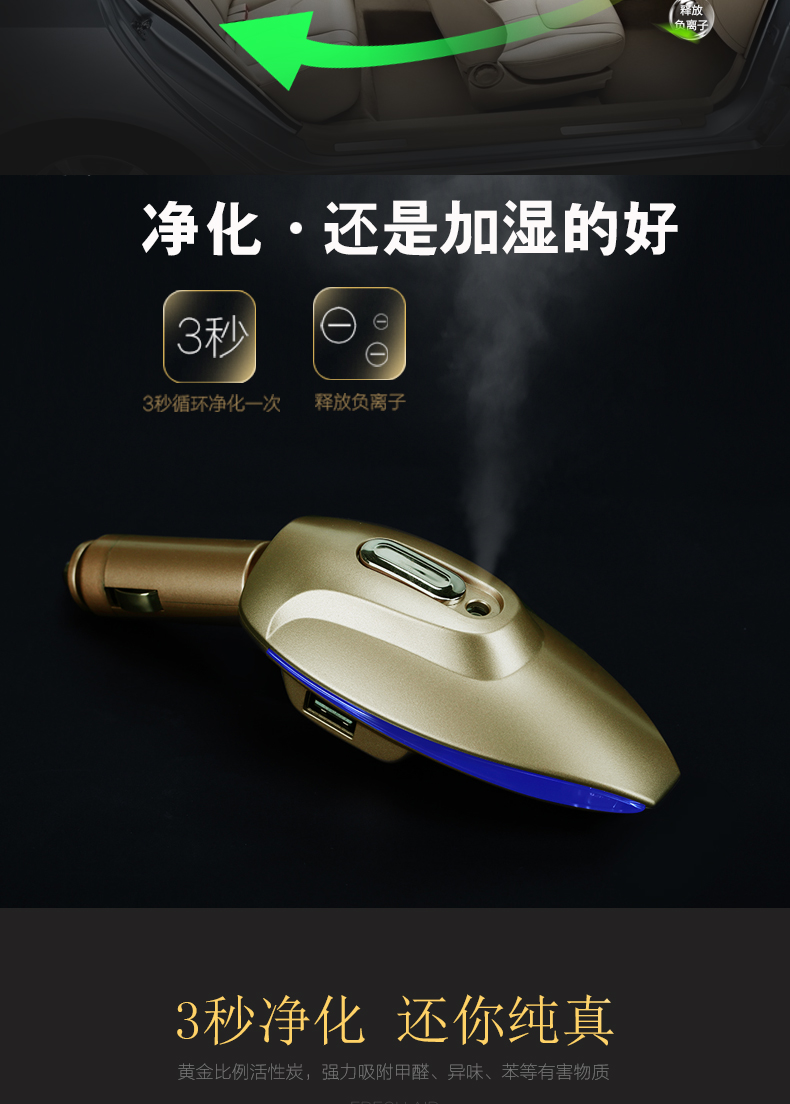 1、多功能合一:納米霧化、負離子、香薰、雙USB車充(12-