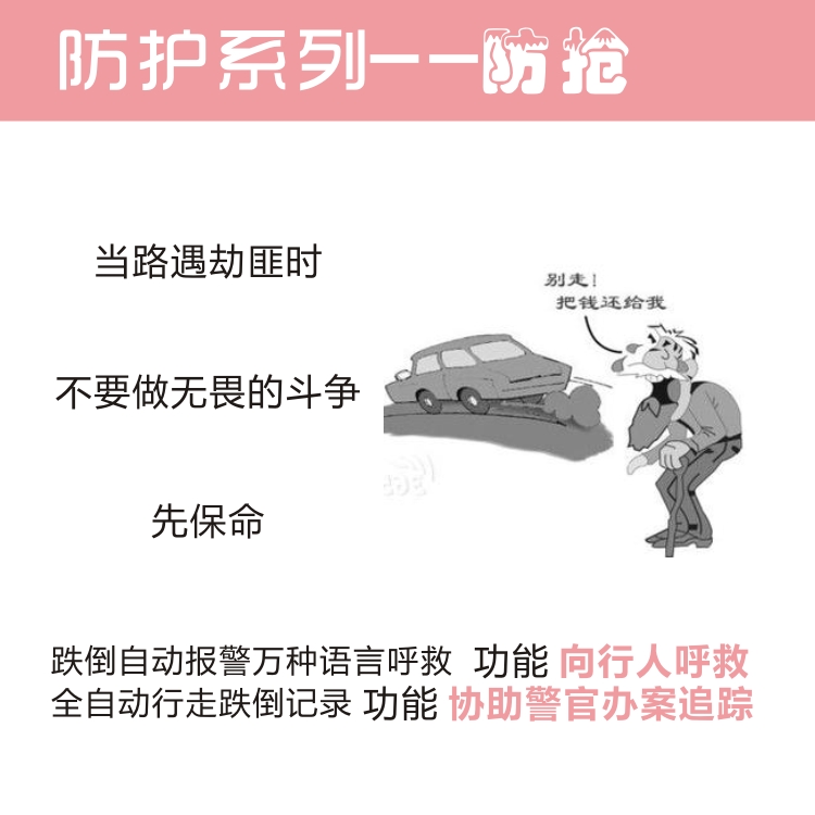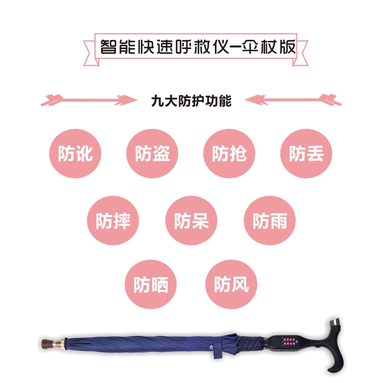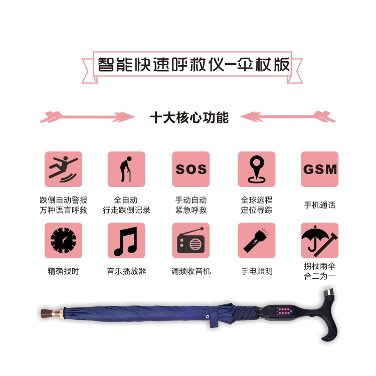 德智源傘杖結合式智能快速呼救儀是一款九防十三五產品。九防:防訛、防盜、防搶、防丟、防摔、防呆、防雨、防風、防曬;十大功能:跌倒自動閃光警報萬種語言呼救、全自動行走跌倒記錄、精準報時、SOS緊急呼救、手機通話、APP全球遠程定位尋蹤、音樂播放器、FM收音機、手電照明、雨傘拐杖方便二合一簡單一分為二;有效解決三大痛點:老人跌倒“扶與不扶”的社會痛點;老人獨處“好與不好”的家庭痛點;老人使用“牛與不?!钡膫€人痛點。 您養我長大,我寵您到老,快速呼救儀,陪伴爸媽守護愛!
