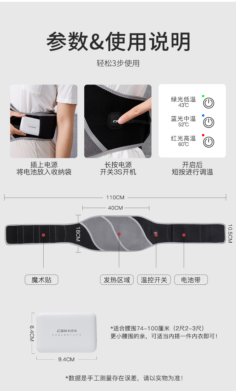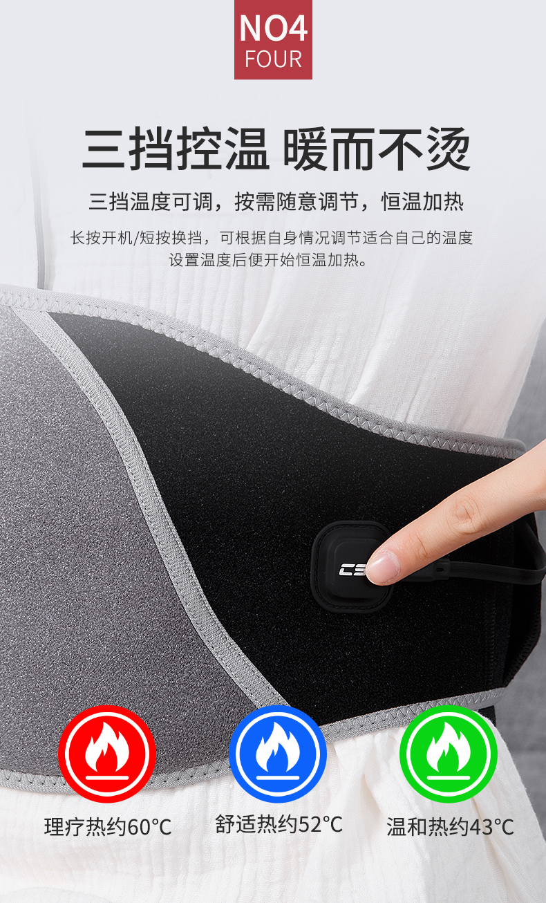 三檔溫度:低溫43℃左右、中溫52℃左右、高溫60℃左右