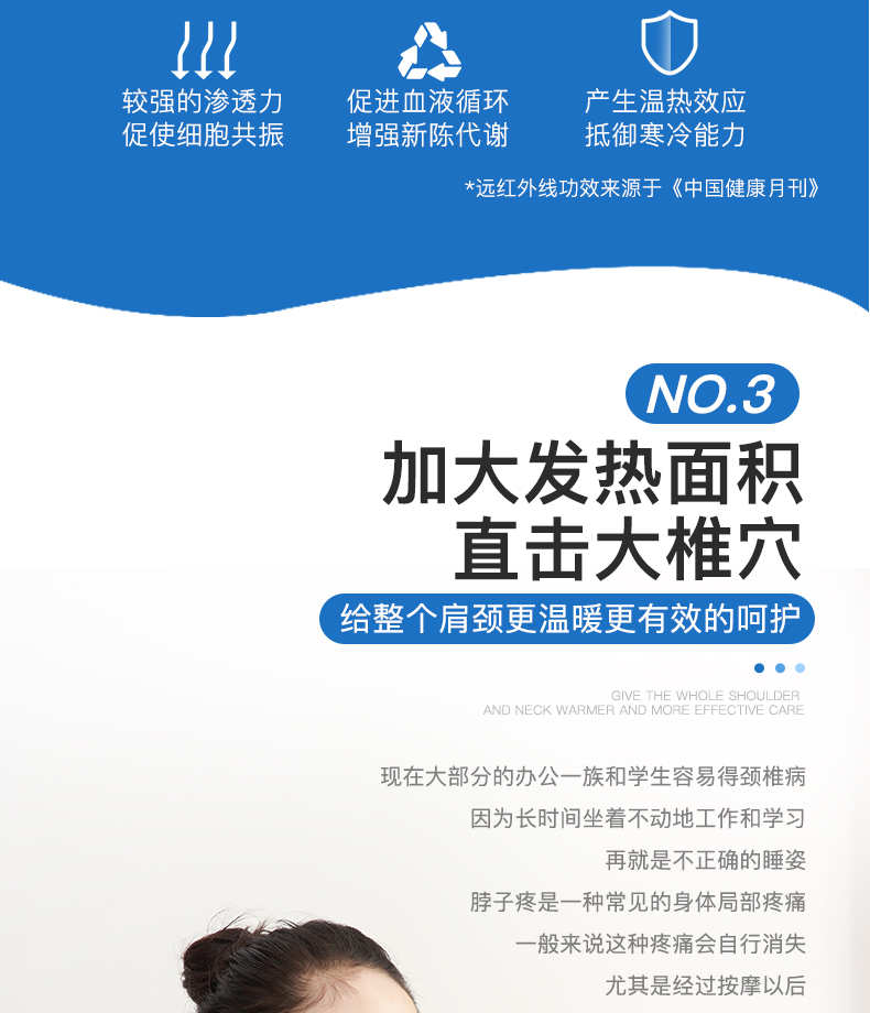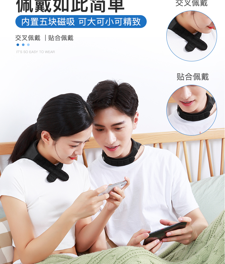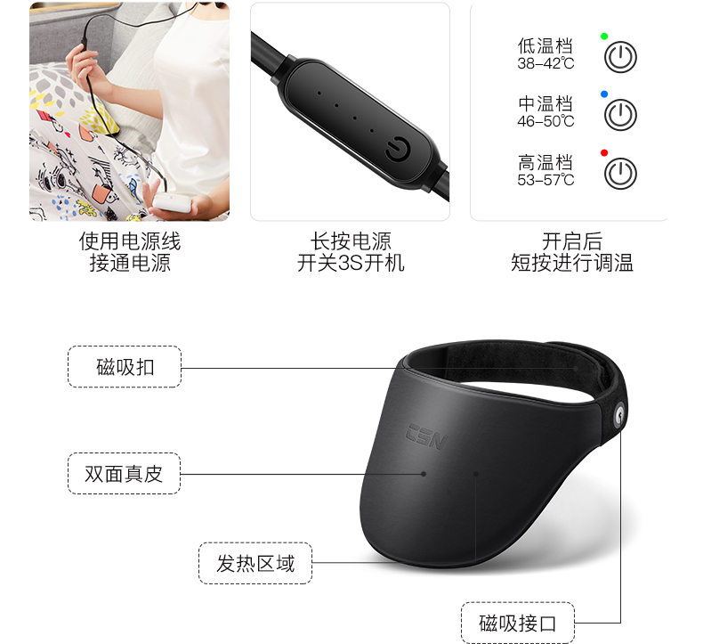 近人體遠紅外生物光波呵護 遠紅外護理 呵護頸部更有效超大發(fā)熱面積 直擊大椎穴精選優(yōu)質羊皮 貼膚親和無束縛三檔可調 隨心而熱磁吸接口 簡單時尚貼心磁吸扣 佩戴如此簡單