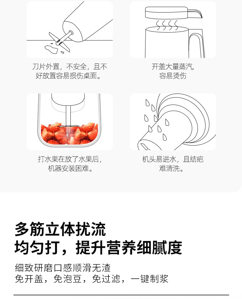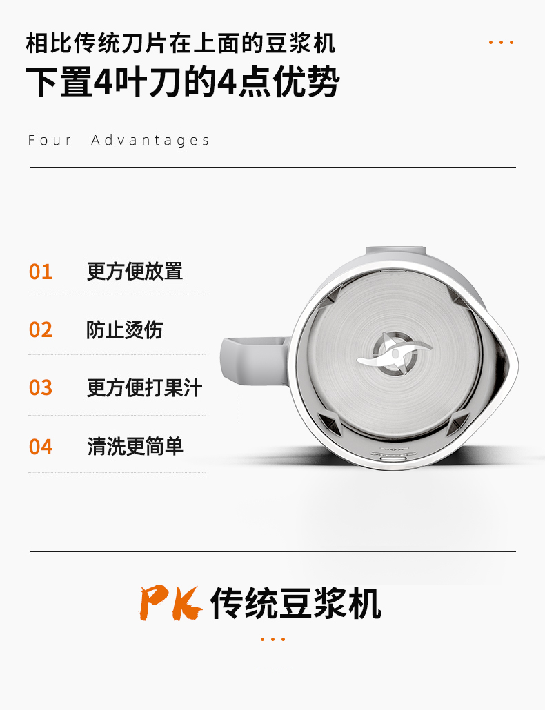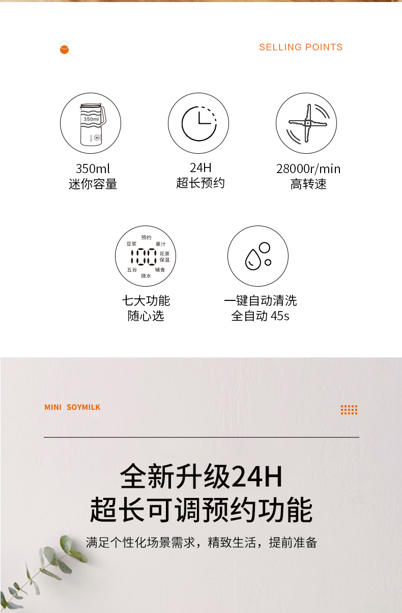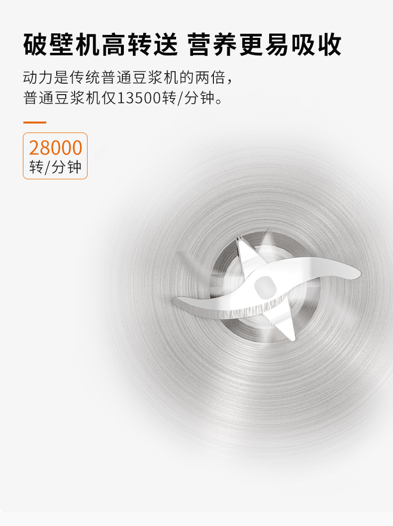 1、功能多樣,打豆漿、榨果汁、燒開水、做輔食、保溫等 2、打豆漿無需泡豆、豆漿細膩無需濾渣。 3、每分鐘28000轉,破壁標準 4、精致小巧、液晶顯示 5、一鍵清洗功能,配送清潔刷讓清洗更方便