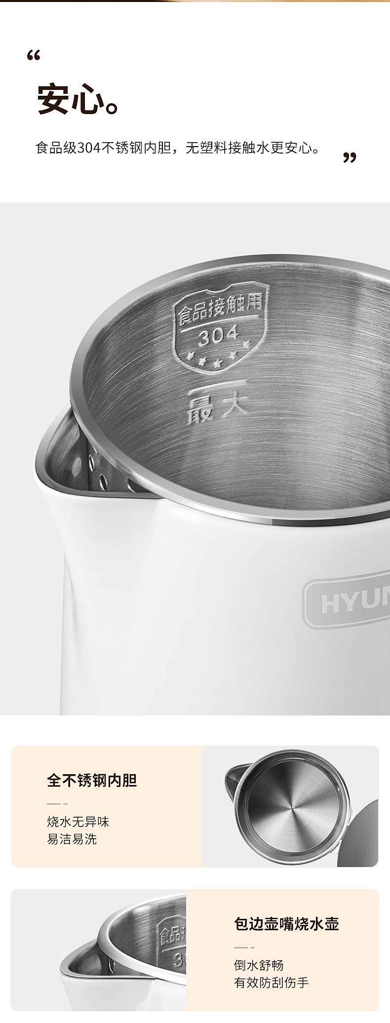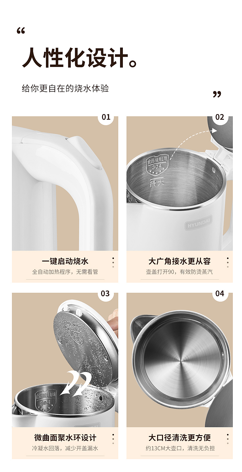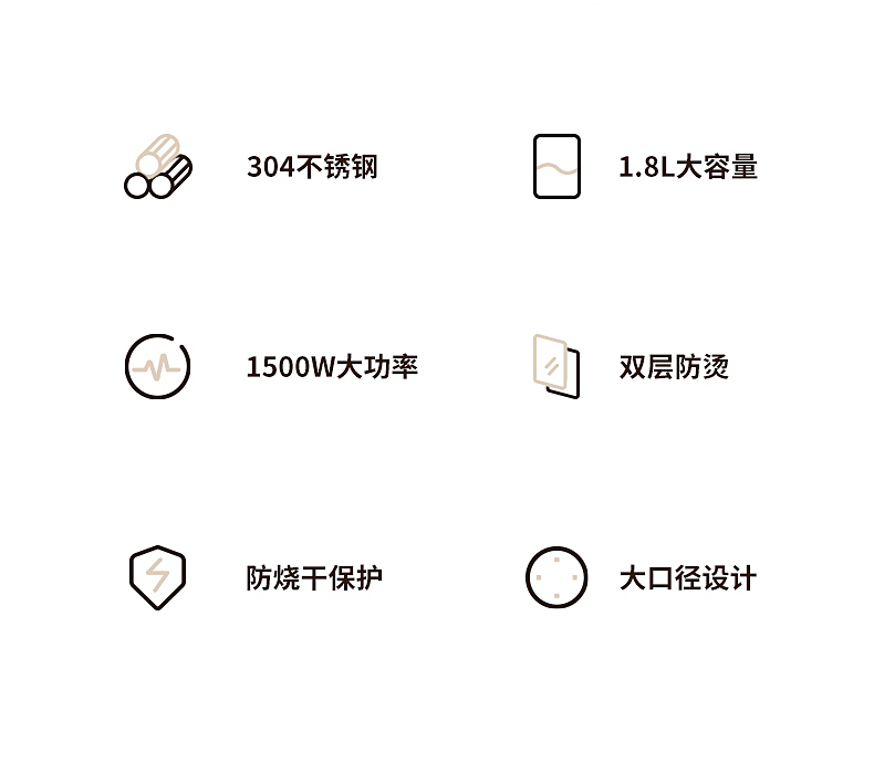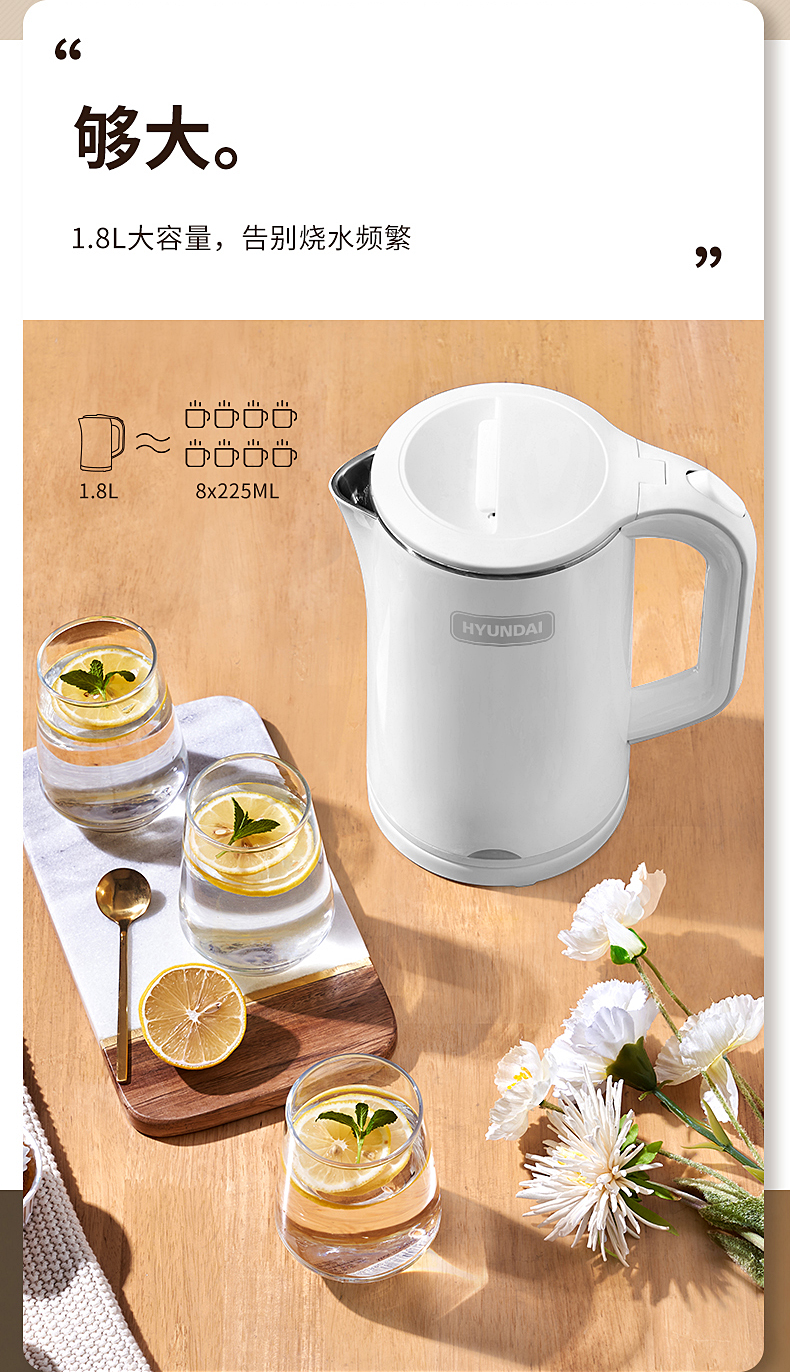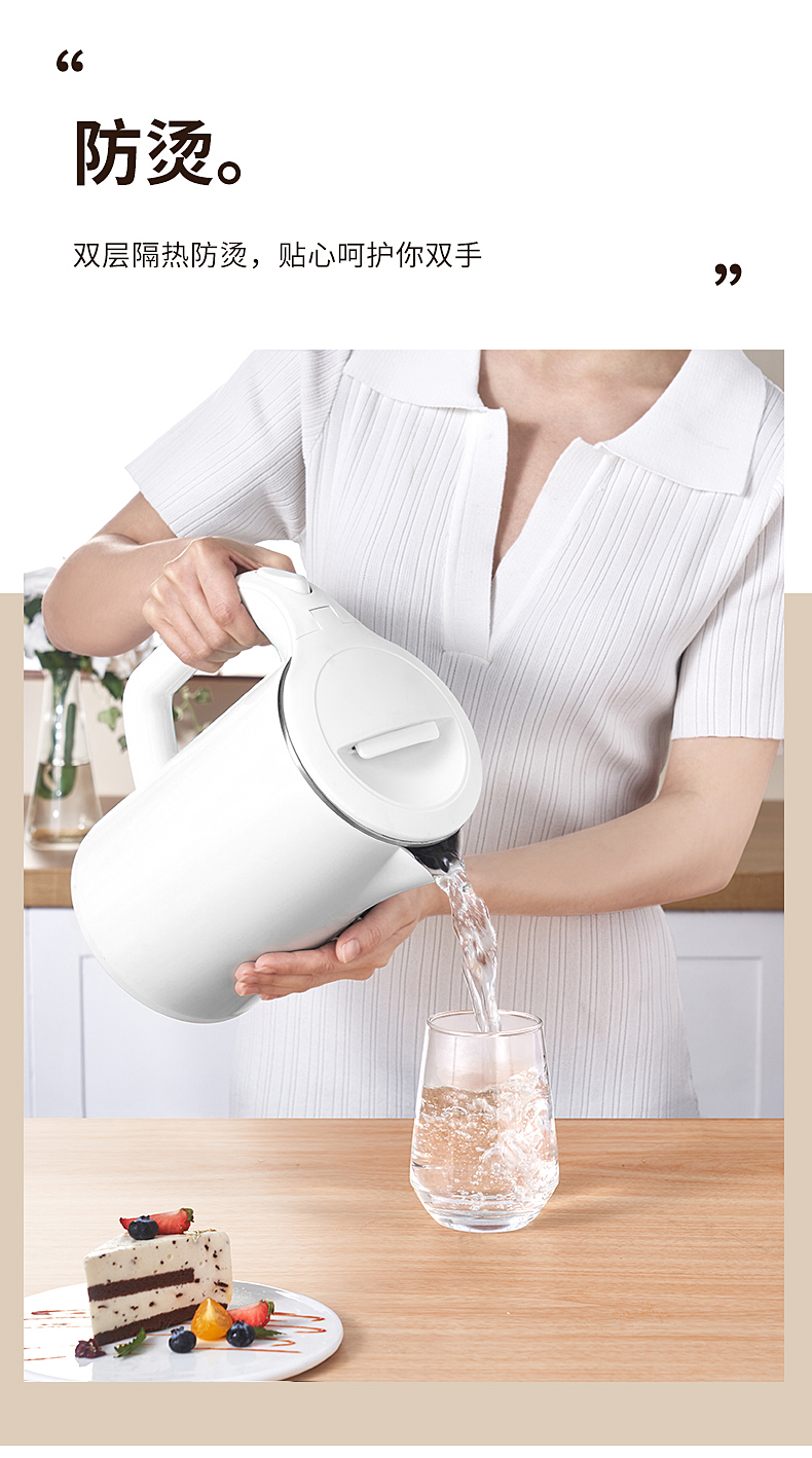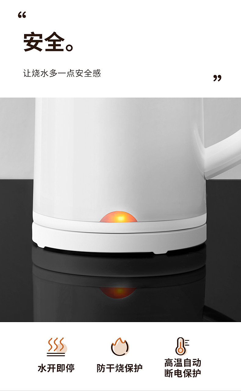 1、一鍵加熱,煮水帶藍(lán)光,操作簡(jiǎn)單快捷,煮水狀態(tài)一目了然; 2、1.8L大容量,滿(mǎn)足多各種飲用需求; 3、快速沸騰,燒水不久候 4、雙層壺身,隔熱防燙;90°防燙開(kāi)蓋,安全防蒸汽;U型壺嘴,水流穩(wěn)定;收納式線盤(pán),收納方便,不占空間 5、加大壺口,清洗無(wú)負(fù)擔(dān) ; 6、防干燒底座,自動(dòng)斷電,防護(hù)更耐用。