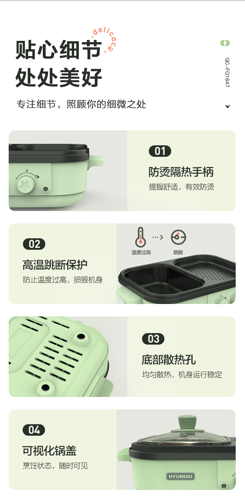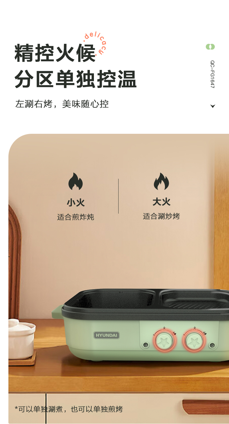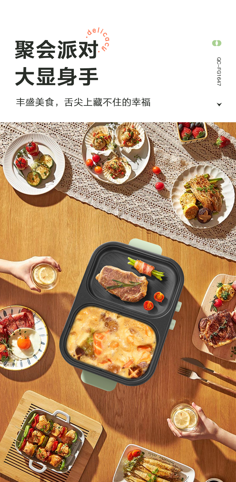 1、兩檔火力,雙鍋分區(qū)獨立溫控,一鍋多用,小聚派對理想選擇; 2、6大烹飪功能煎/烤/炒/煮/焗/燜; 3、內(nèi)膽采用不粘涂層,不焦不粘少油煙 ; 4、一體壓鑄全密封設(shè)計,清洗更便捷; 5、拆卸式電源線,方便收納與清潔; 6、可視化玻璃鍋蓋,隨時把握烹飪進度。