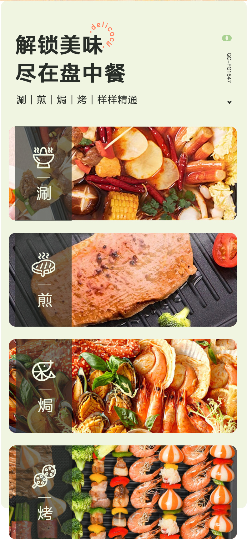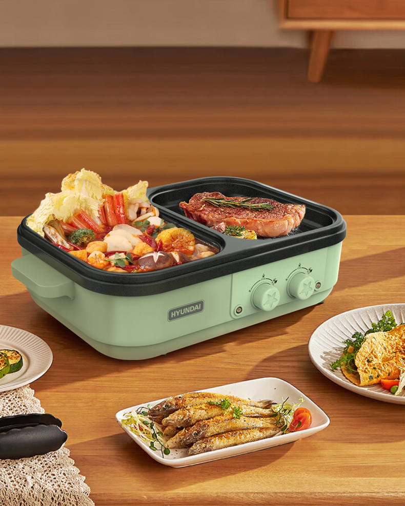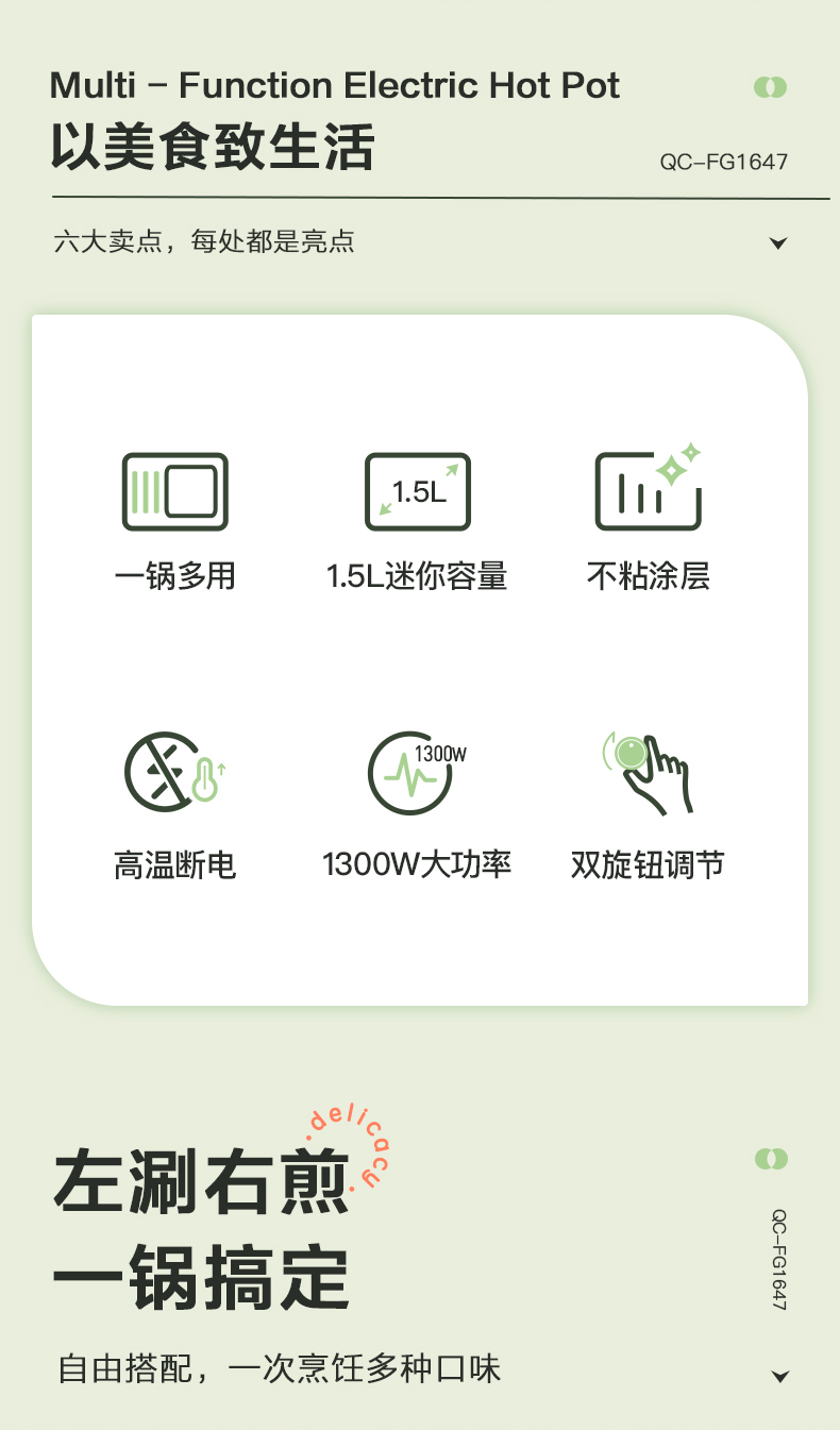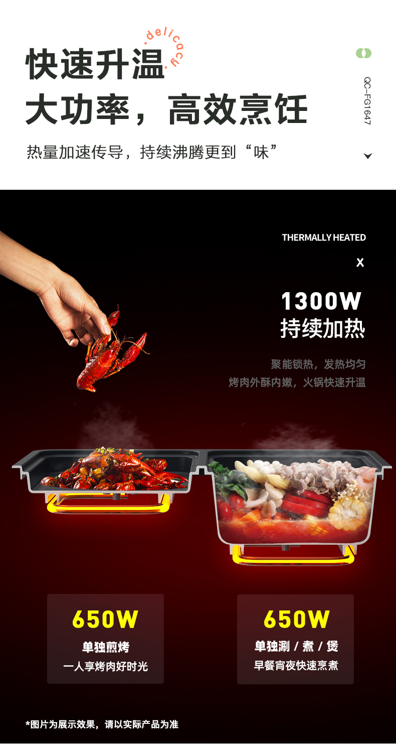 1、兩檔火力,雙鍋分區(qū)獨立溫控,一鍋多用,小聚派對理想選擇; 2、6大烹飪功能煎/烤/炒/煮/焗/燜; 3、內(nèi)膽采用不粘涂層,不焦不粘少油煙 ; 4、一體壓鑄全密封設(shè)計,清洗更便捷; 5、拆卸式電源線,方便收納與清潔; 6、可視化玻璃鍋蓋,隨時把握烹飪進度。