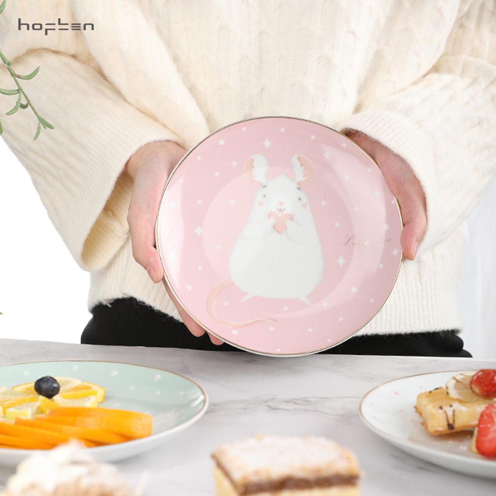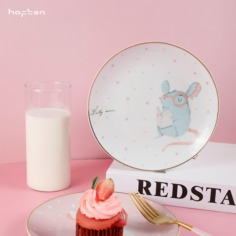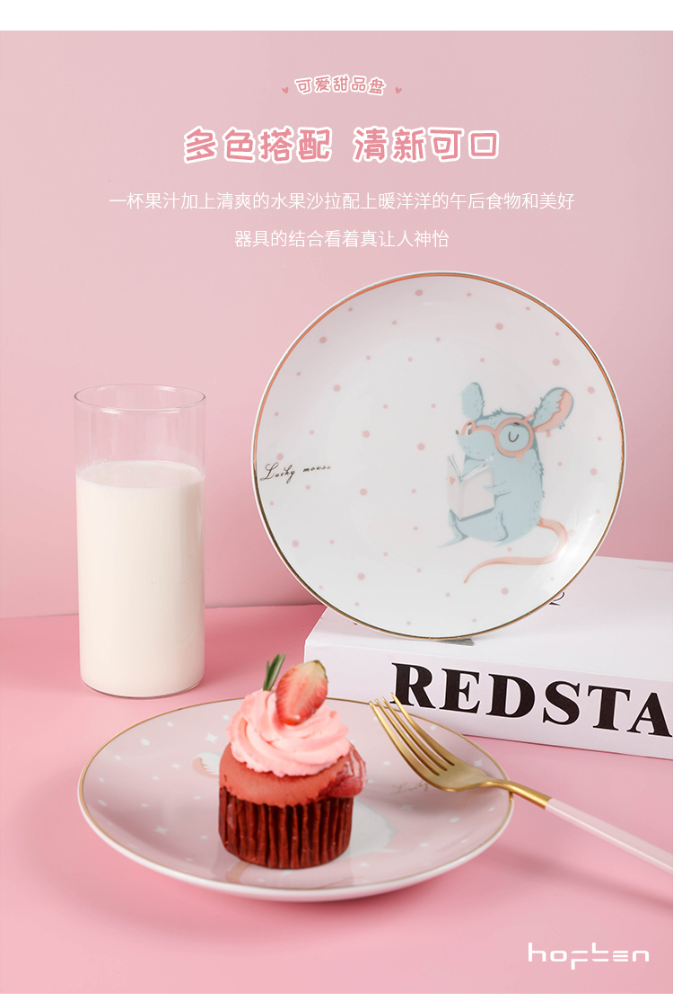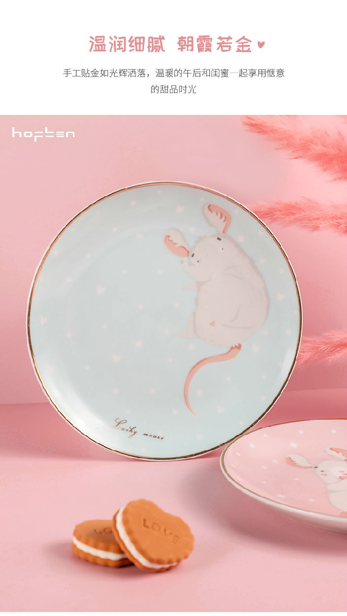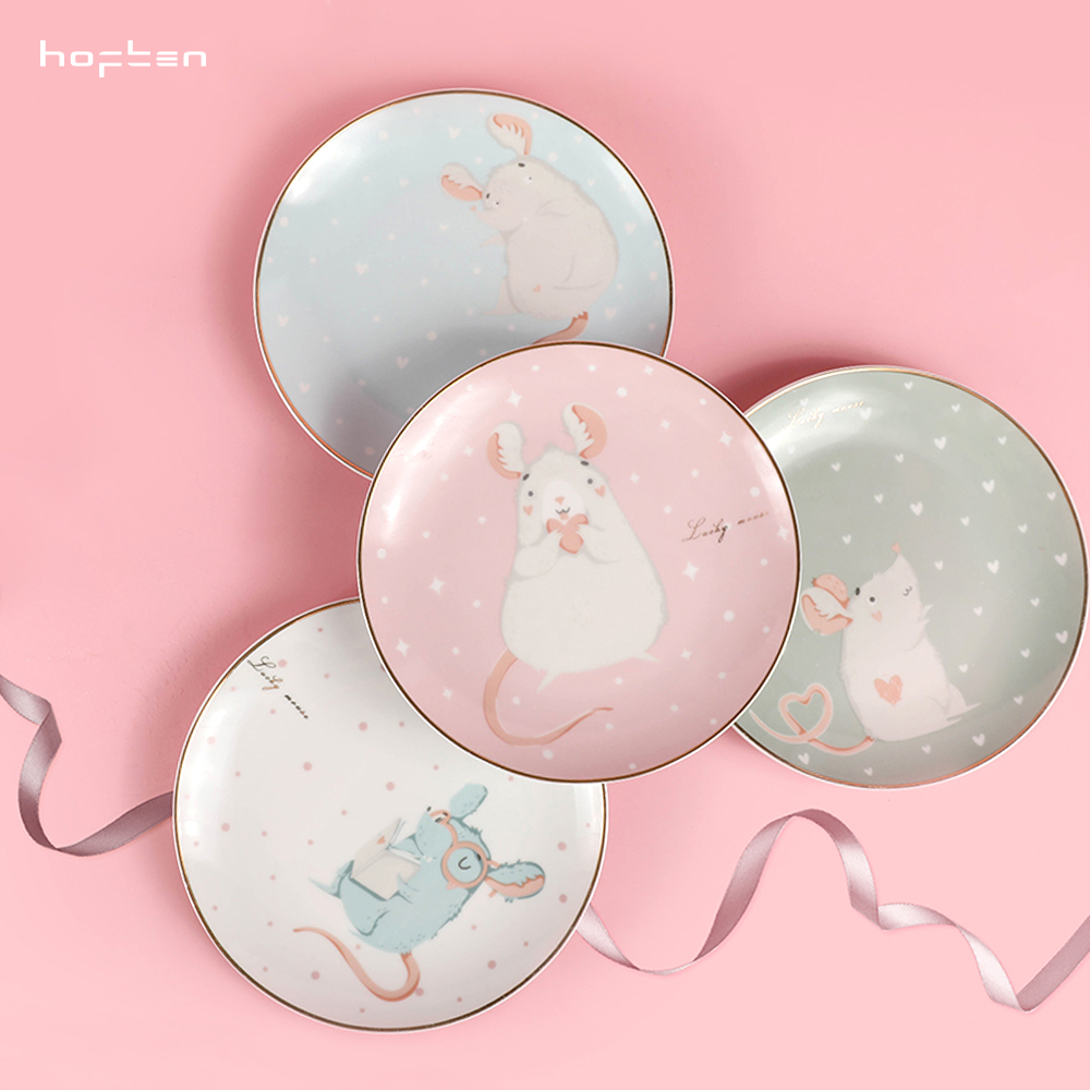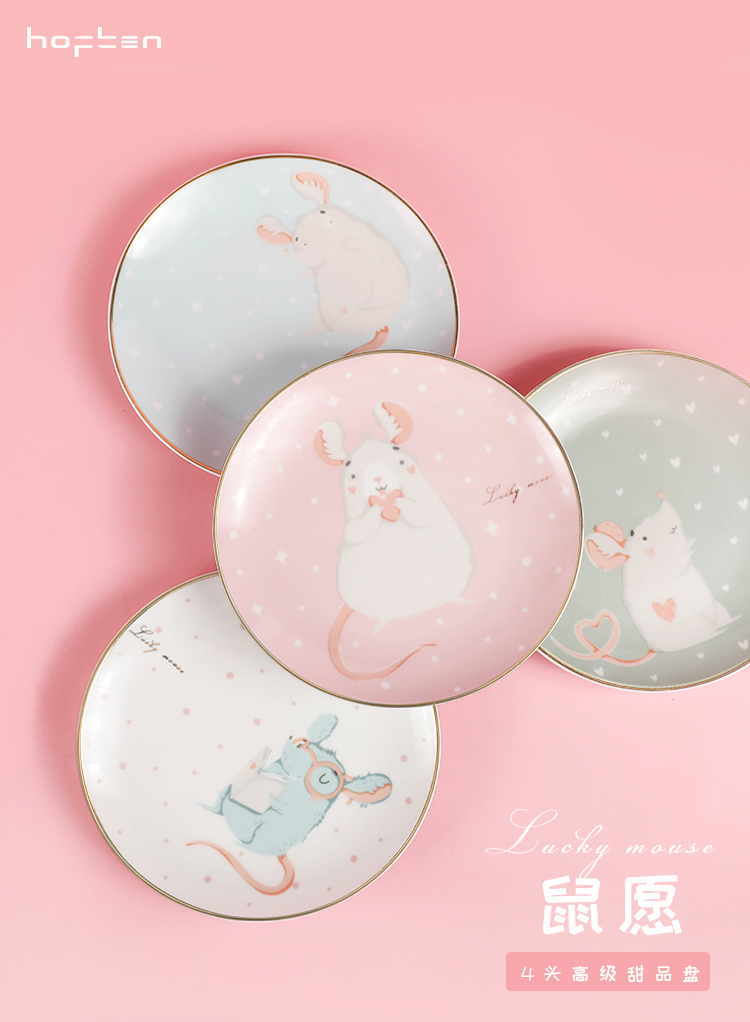 赫芬盤子家用碗盤鼠愿4頭高溫陶瓷甜品盤餐具可愛蛋糕盤卡通4件套