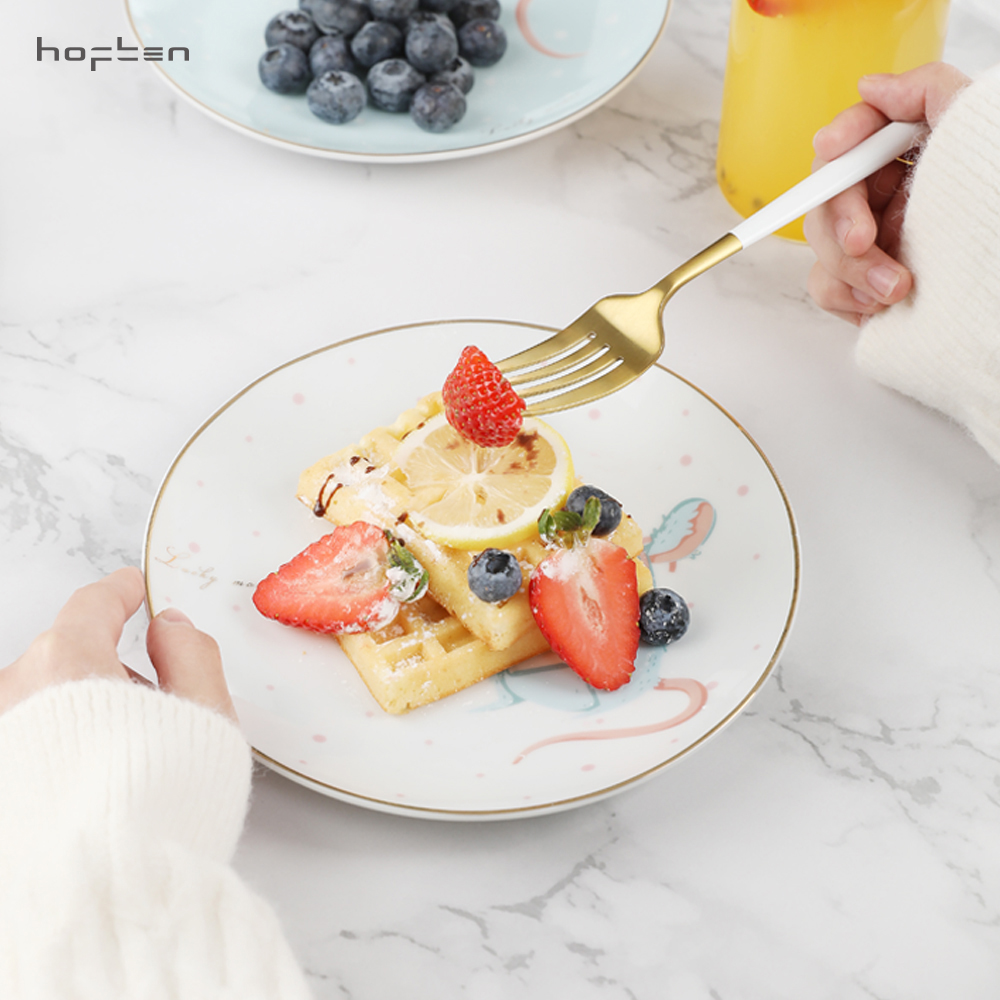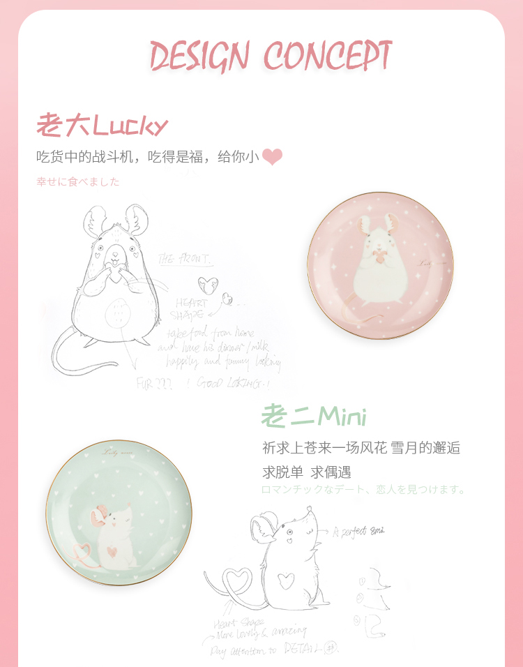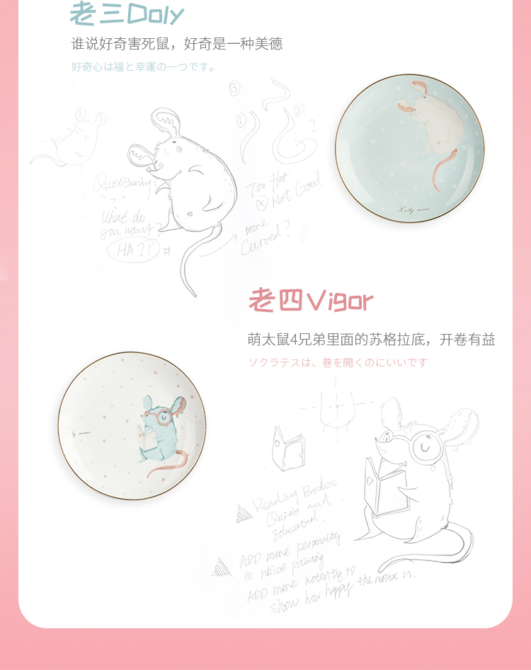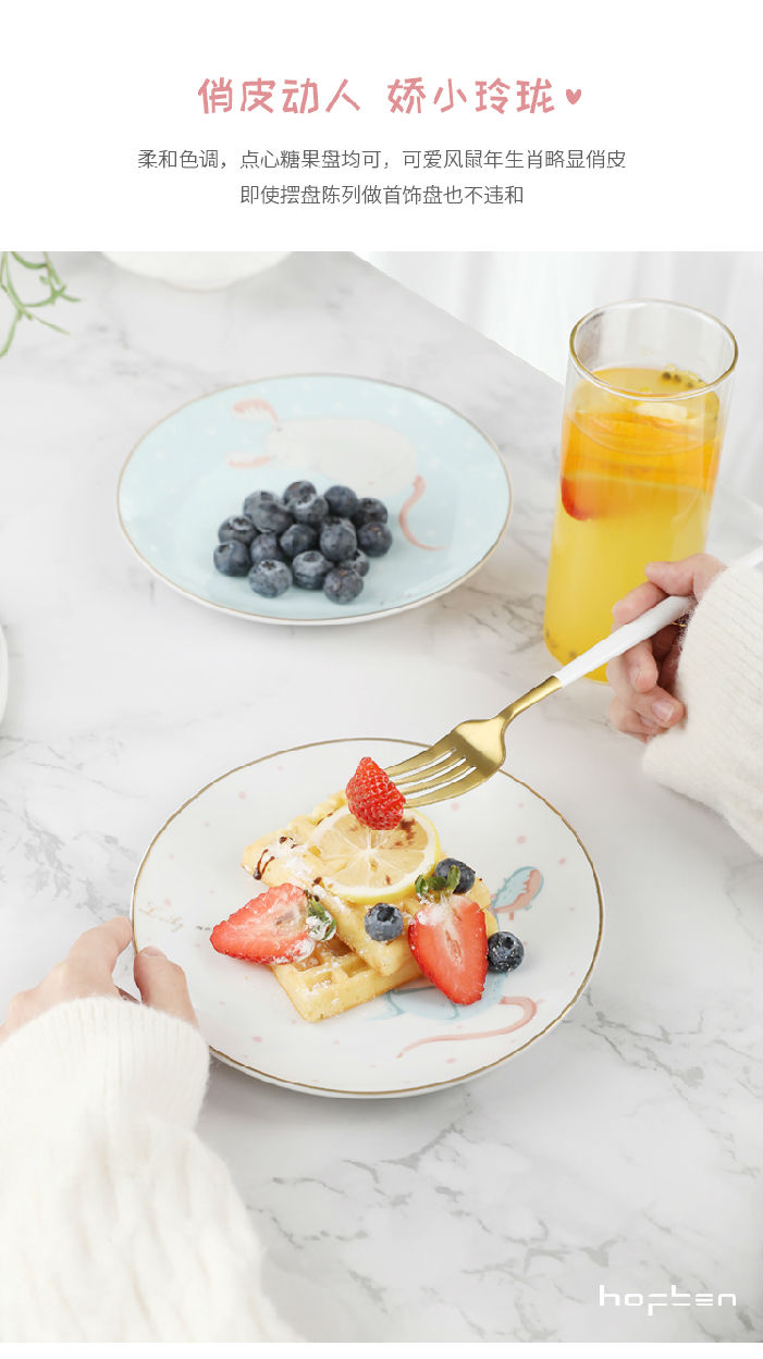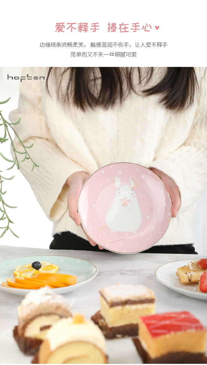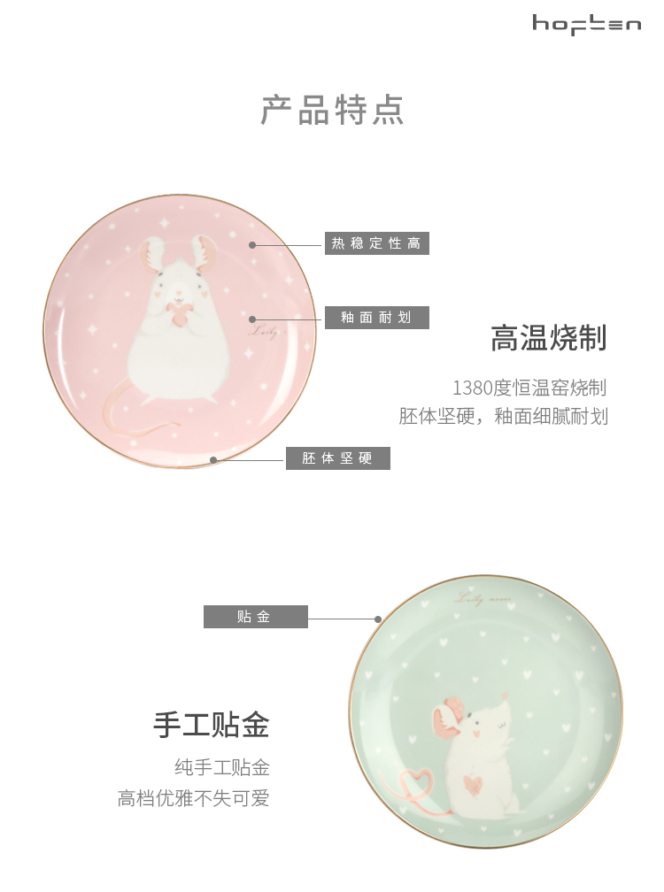 赫芬盤子家用碗盤鼠愿4頭高溫陶瓷甜品盤餐具可愛蛋糕盤卡通4件套